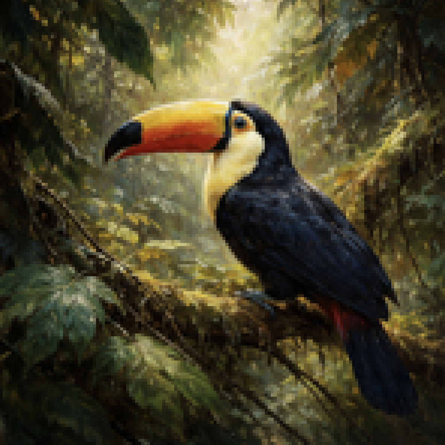 Doch der Tukan wirkt nicht eilig. Er bewegt sich bedacht zwischen Ästen, beobachtet, wägt ab. Seine Farben erscheinen laut, sein Verhalten ist es nicht. In der Höhe des Blätterdachs lebt er in einer Zone zwischen Licht und Schatten, dort, wo Früchte reifen und Zeit langsamer vergeht. Seine Präsenz ist punktuell – sichtbar, dann wieder verschwunden.
